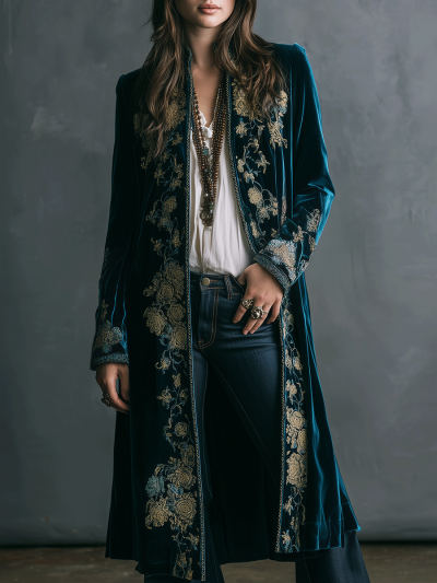 Vintage Chocolate Velvet Embroidered Long Coat