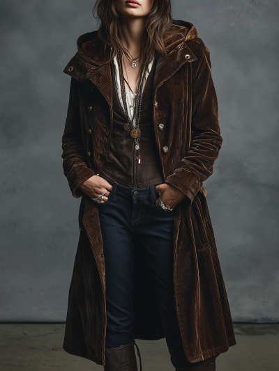 Vintage Brown Velvet Long Hooded Coat