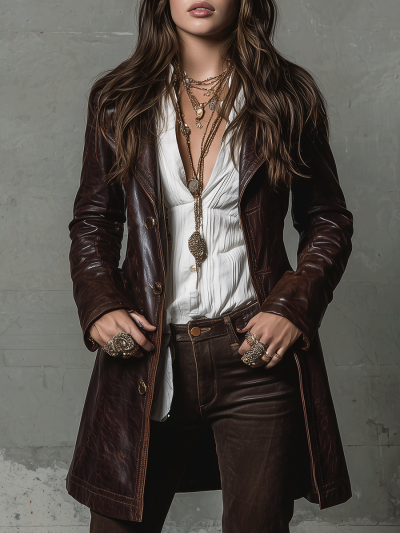 Vintage Brown Eco-Leather Long Coat
