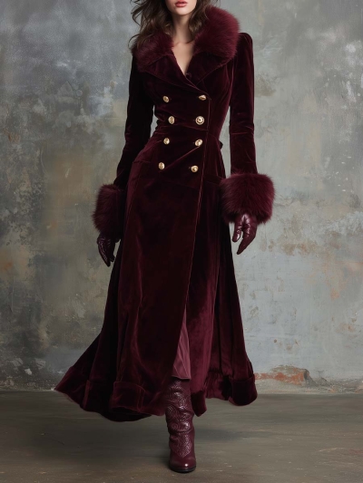 Velvet Long Coat With Faux Fur Collar & Cuffs – Burgundy Wine