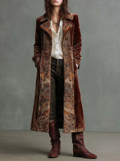 Velvet Paisley Trim Maxi Coat
