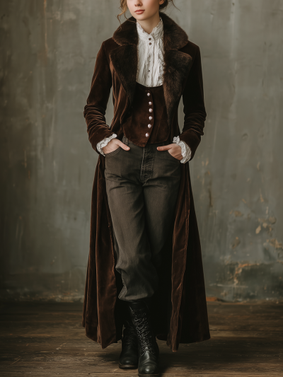Retro Contrast Color Trim Polyester Velvet Long Coat