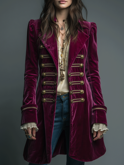 Regal Burgundy Velvet Officer-Inspired Coat