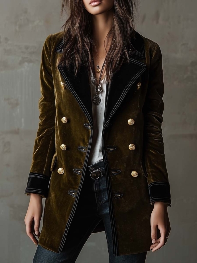 Olive Synthetic Velvet Double-Breasted Military Coat