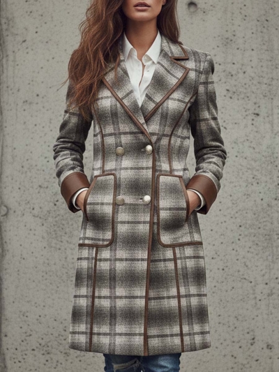Plaid Print Faux Suede Coat With Leather Trim