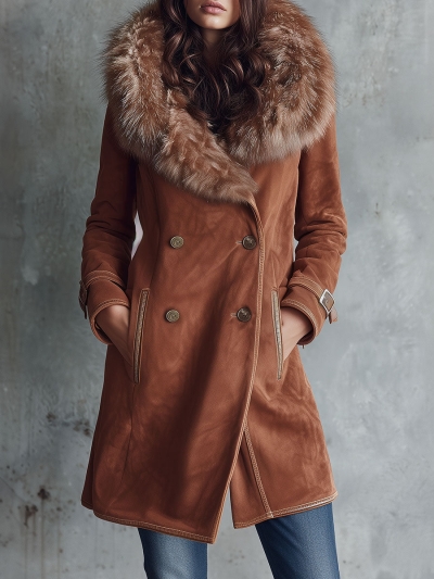 Elegant Bohemian-Style Coffee-Colored Faux Suede Warm Coat