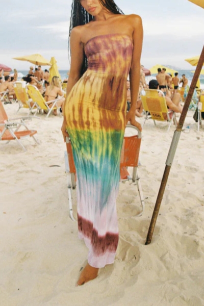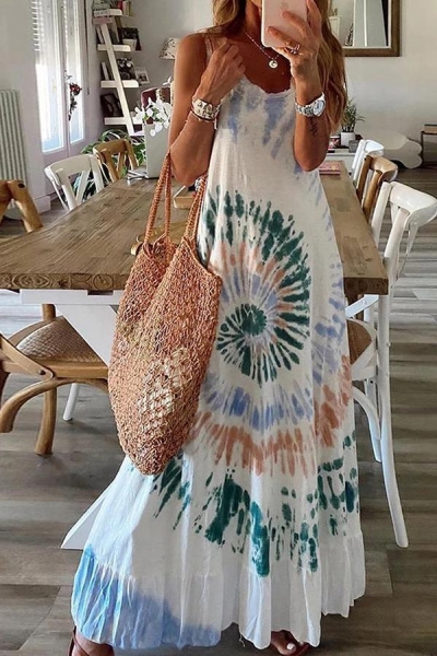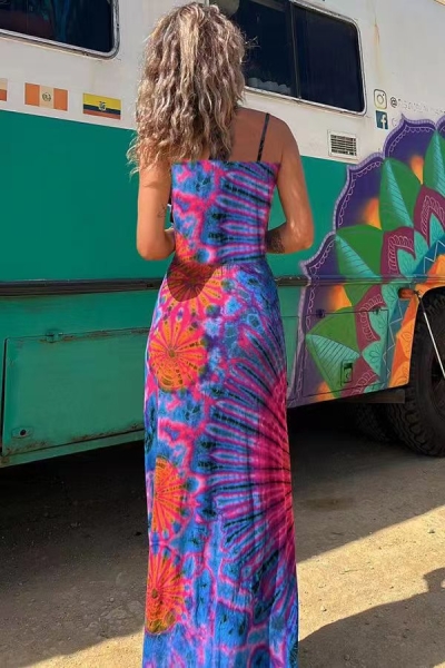 TIE-DYE PRINT DOUBLE SHOULDER STRAP STRETCH MAXI DRESS