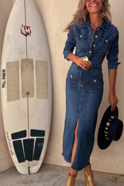 Tessy Denim Metal Button Zipper Shirt Stretch Pencil Slit Midi Dress