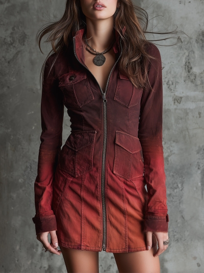 Bohemian Washed Gradient Denim Flap Pocket Slim Mini Dress