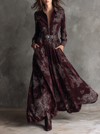Bohemian Suede Shirt Collar Printed Maxi Dress