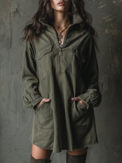 Bohemian Washed Half-zip Loose Denim Mini Dress