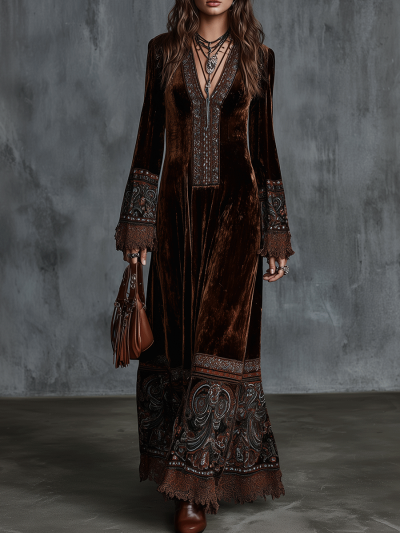 Bohemian Velvet Embroidered Borders Maxi Dress