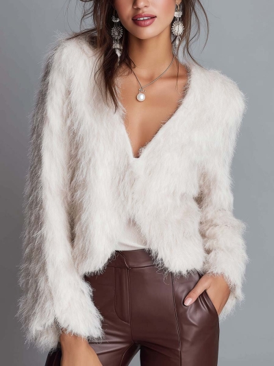 Soft Ivory Faux Fur Jacket With Cozy Feather Texture