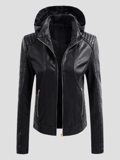 Stylish Warm Lined Detachable Hood Pockets Leather Jacket