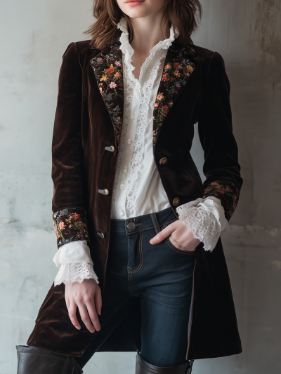 Vintage Floral Printed Velvet Jacket – Midnight Baroque Elegance