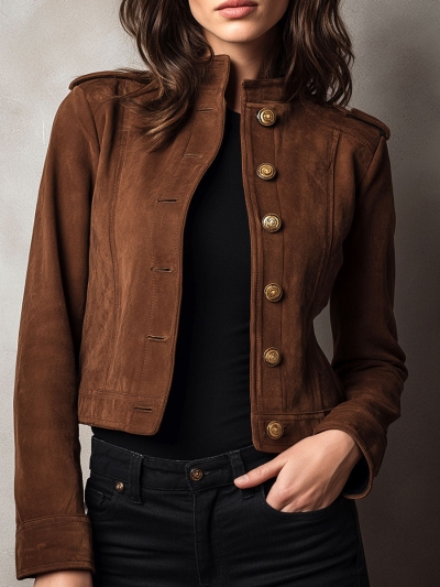 Vintage Military-Inspired Suede Short Jacket With Gold Buttons