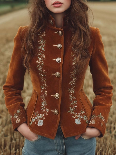 Vintage Microsuede Floral Embroidery Distressed Button Slim-Fit Jacket