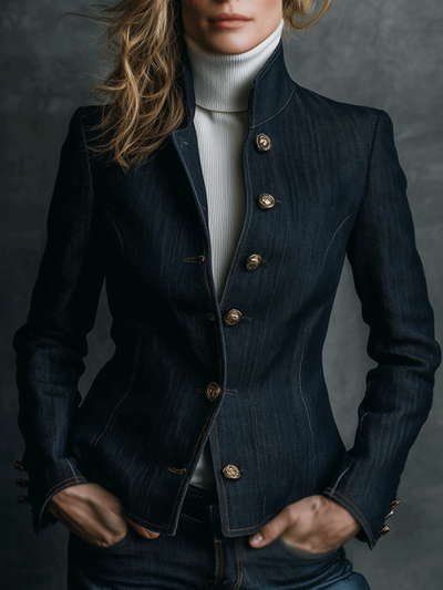Vintage High Collar Classic Curve Cut Denim Brass Button Jacket