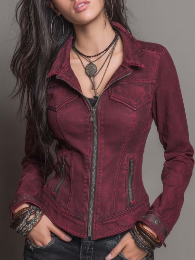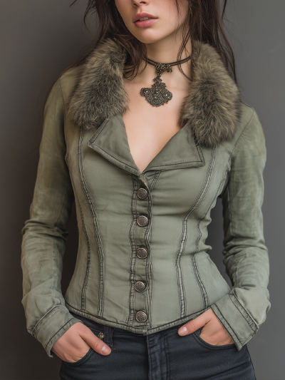 Vintage Eco-friendly Fur Collar Distressed Slim-fit Jacket