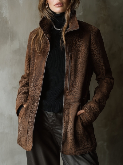 Vintage Distressed Suede Leopard Print Straight Jacket