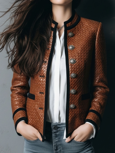 Vintage Eco-friendly Leather Lace Trim Diagonal Placket Jacket