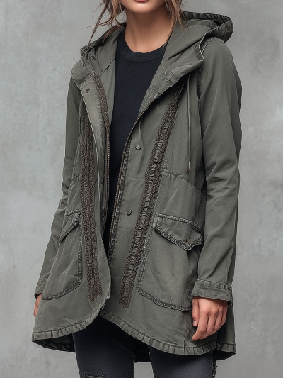 Utility Army Green Washed Denim Hooded Cargo Parka Jacket With Pockets