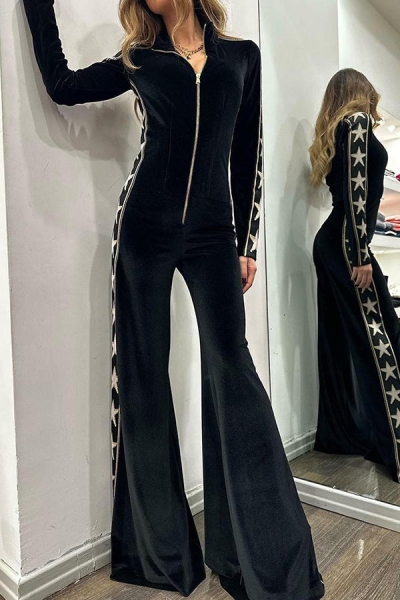 Long-sleeved velvet jumpsuit with zipper