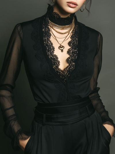 Romantic Black Sheer Mesh Sleeve Lace High Neck Top