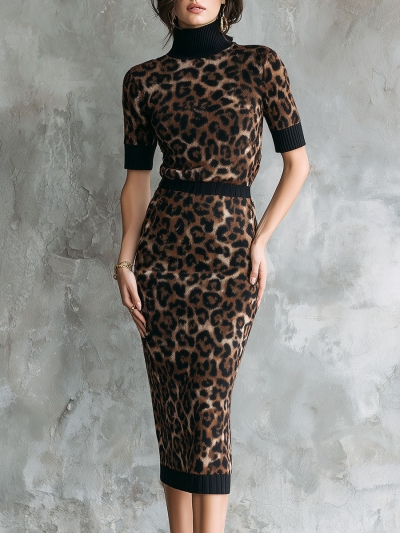 Leopard Print Knit Turtleneck Top And Matching Pencil Bodycon Skirt Set