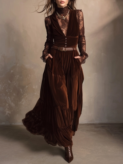 Retro Turtleneck Lace Top & Velvet Vest Maxi Dress Set With Belt
