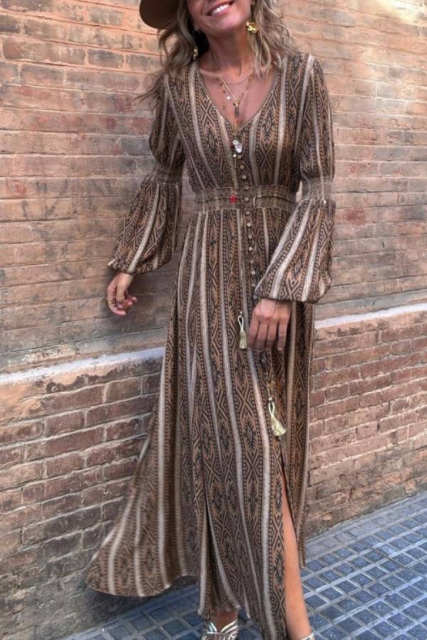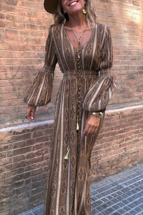 Long dress, V-neckline, elastic waist, elastic cuff sleeves and ruffled hem, with gold thread lines