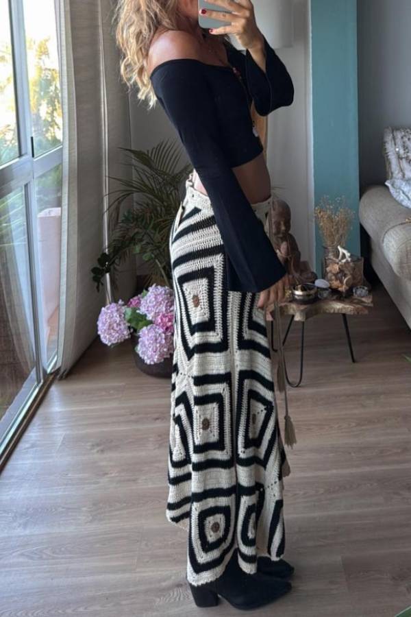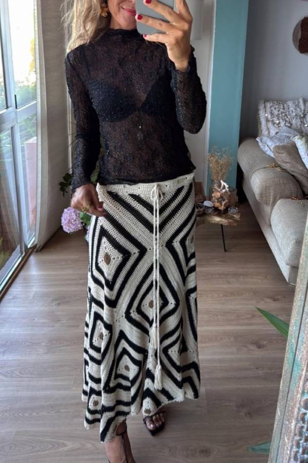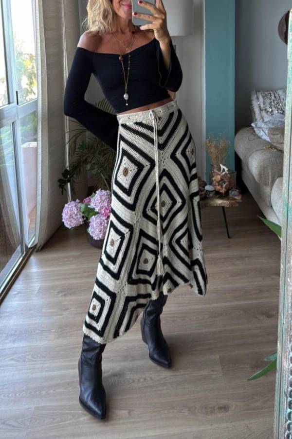 Asymmetric crochet skirt with adjustable drawstring waist in the same fabric, unlined