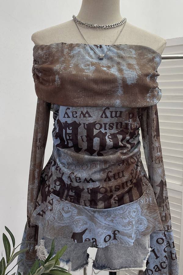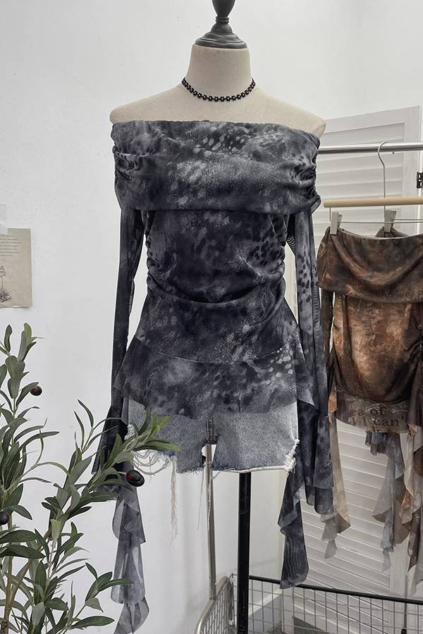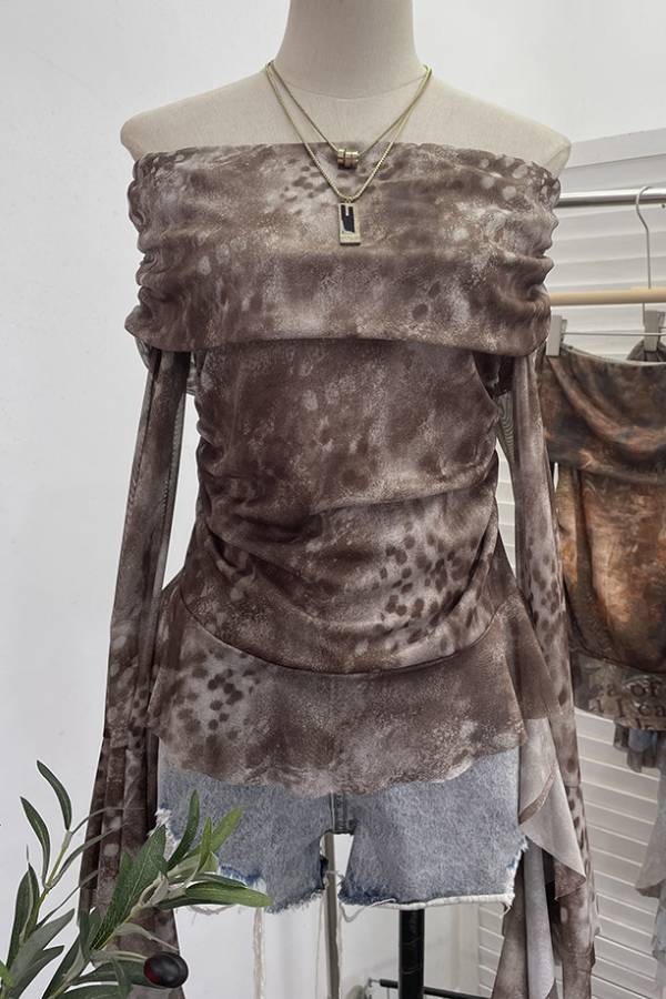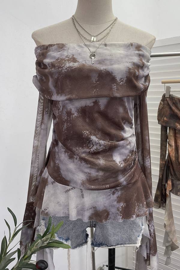 The light and breathable mesh fabric is crafted with artistic prints like tie-dye, text, and vintage textures to create a unique visual dimension. The off-the-shoulder design elegantly reveals the shoulders and neckline, while pleats at the bust and waist cleverly define the figure and add a sense of depth. The flowing long sleeves sway naturally with movement, adding a dynamic touch to the overall look. Perfect for trendy outings, casual parties, and more, this piece effortlessly creates an eye-catching "artistic niche + sexy and laid-back" look.