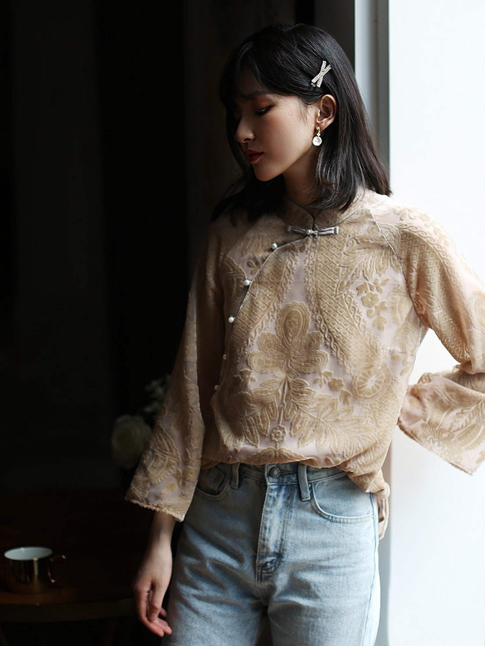 ⭐ High Light: Classical Chinese Flowers pattern, Mandarin High Collar, Pankou button that can be un-button! Trumpet Sleeves;