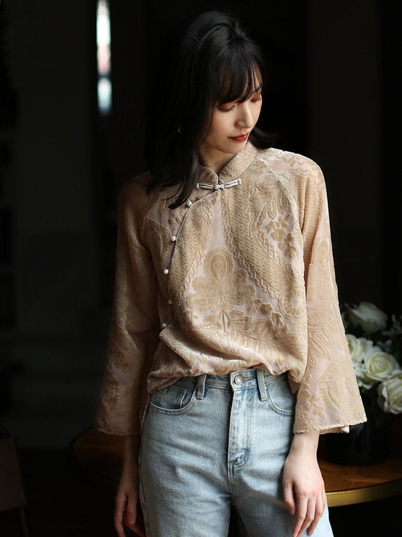 Autumn China Cheongsam Top, Chinese Tang Suit Hanfu Blouse,Tea Ceremony Shirt, Traditional Jacquard Velvet Fabric, Side Open Pankou