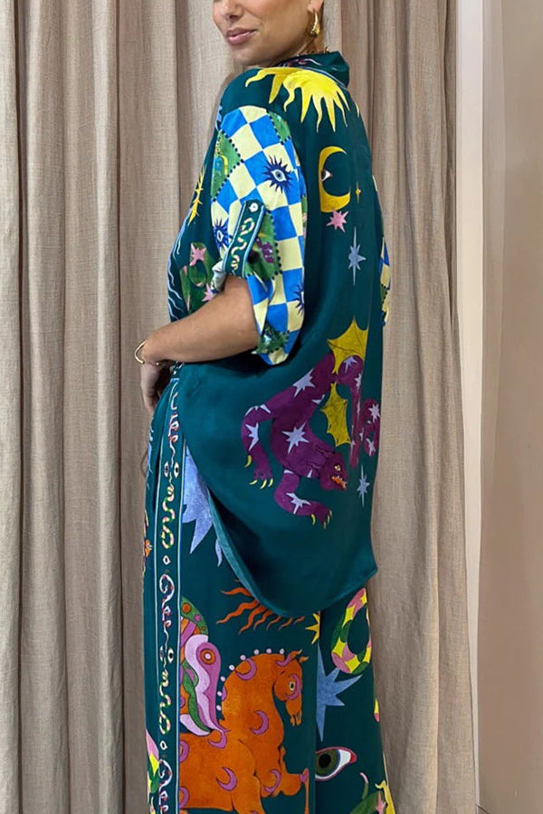 Beachy Chic Linen Blend Unique Print Button Down Oversized Blouse