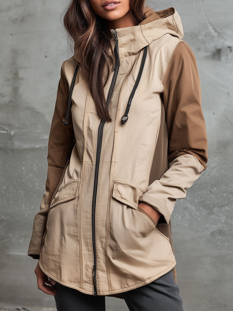 Beige & Brown Colorblock Hooded Utility Jacket