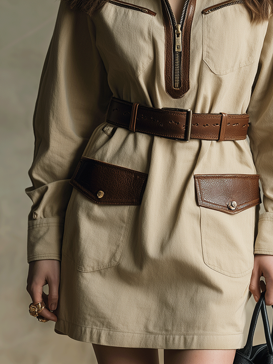 - Design: Mini dress with a utility chic safari style, featuring a zip-front closure for ease and a belted waist for a flattering fit.