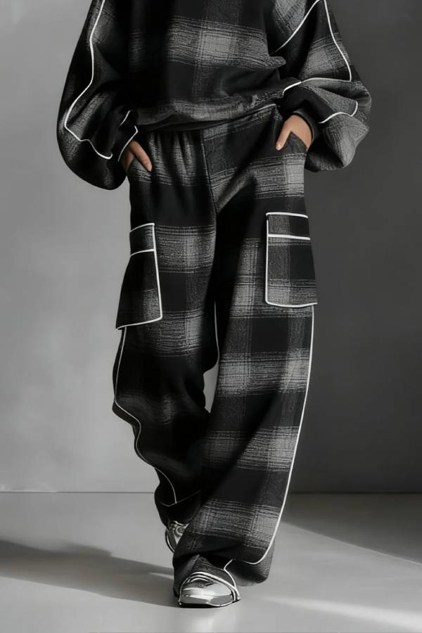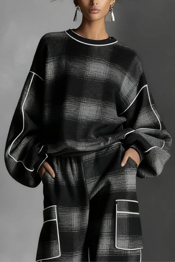 Black and Gray Plaid Color-blocked Sweatshirt and Casual Pants Two-piece set