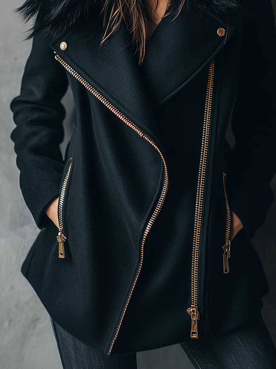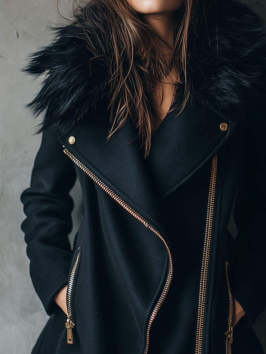 The Black Eco Fur Collar Wool Blend Asymmetrical Zip Moto Coat with Gold Hardware is a versatile piece that merges functionality with fashion. Its unique design and luxurious details make it a standout addition to any wardrobe, ready to be styled for both daytime and evening occasions.