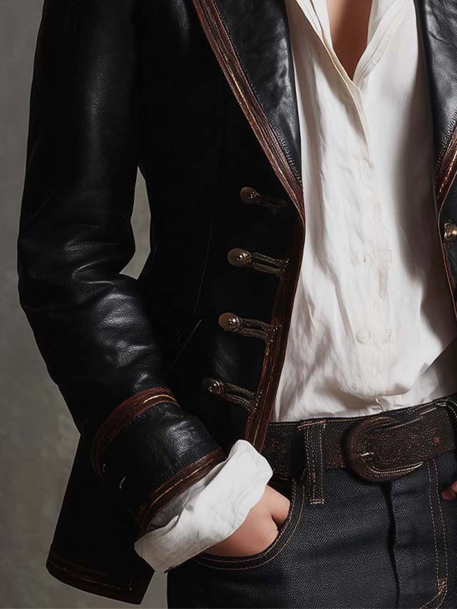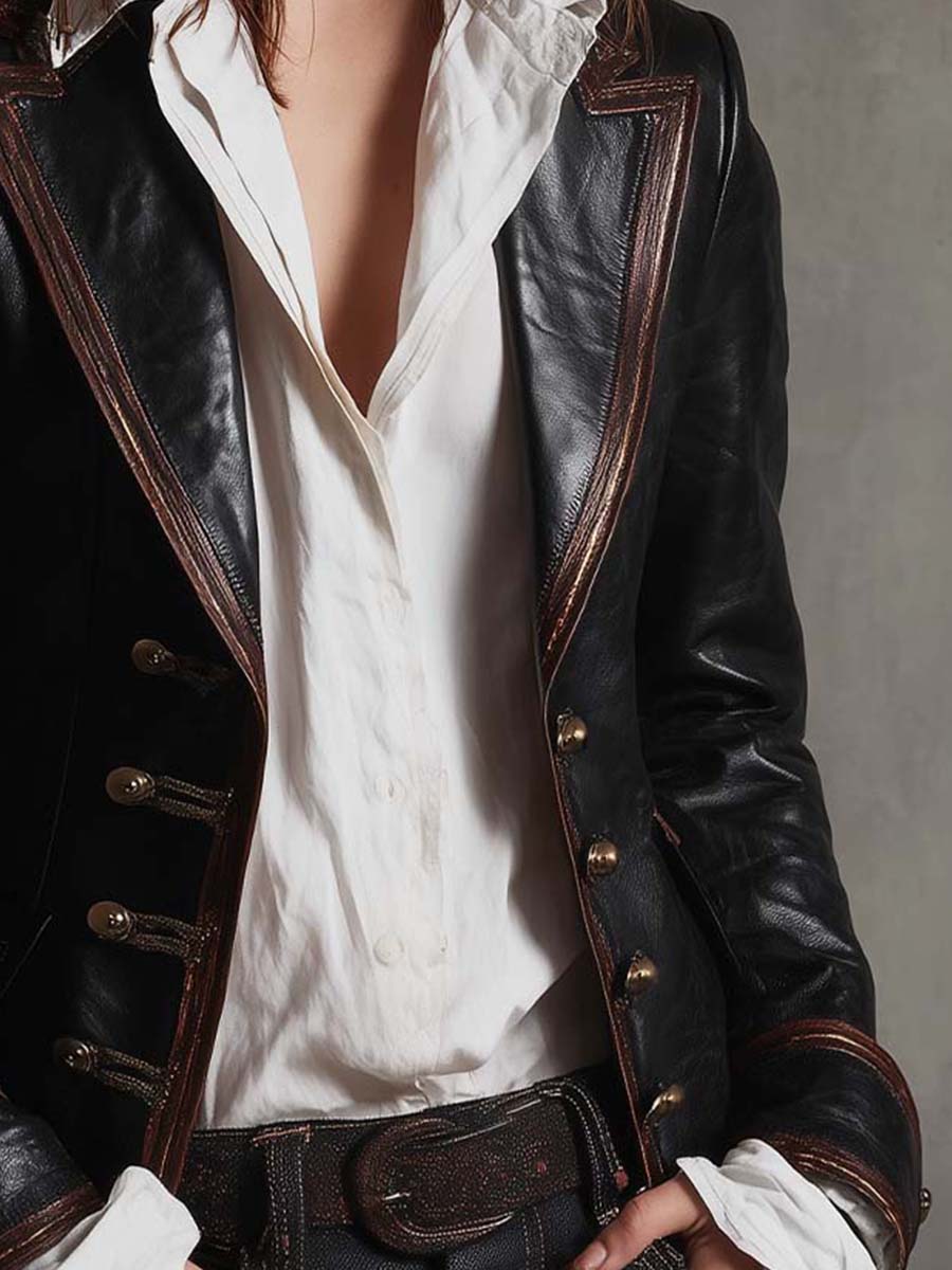 A statement-making blazer crafted from supple black leather with vintage-inspired detailing. Featuring sharp tailoring, contrast brown edging, and brass-style buttons, this piece channels a refined military aesthetic with modern edge. Its structured silhouette and luxurious finish make it an essential for bold, confident dressing.