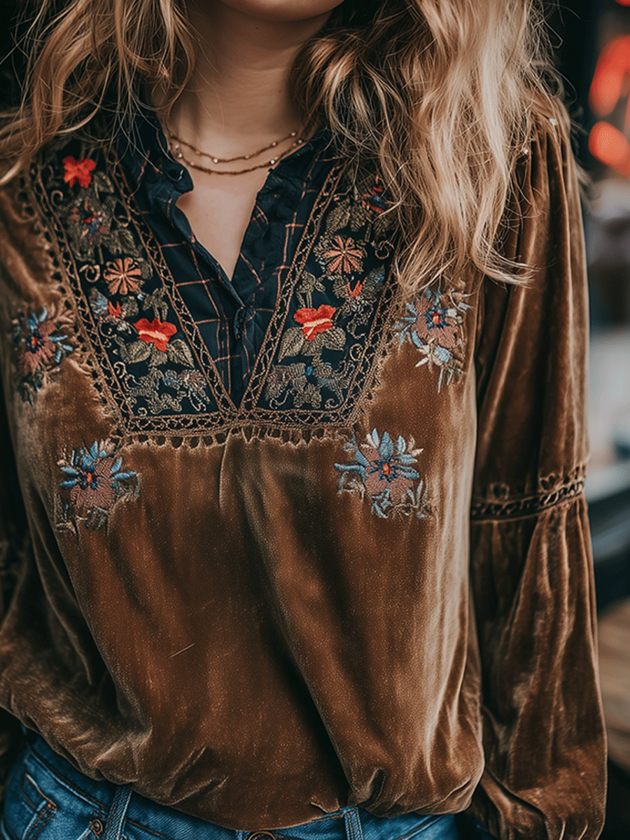 Bohe Brown V-Neck Velvet With Floral Embroidery And Lace Blouse