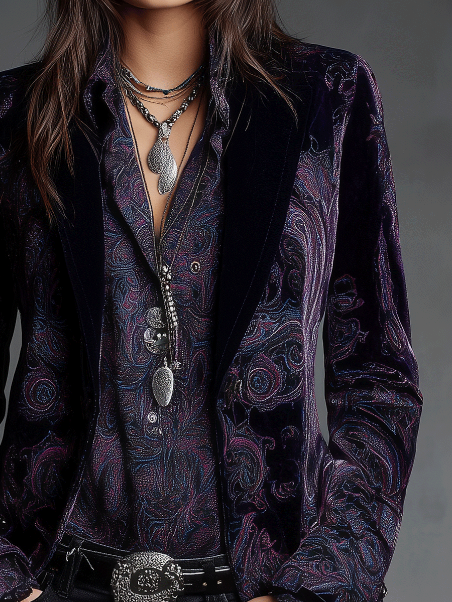 - Intricate paisley design that adds a classic touch to the contemporary blazer style.