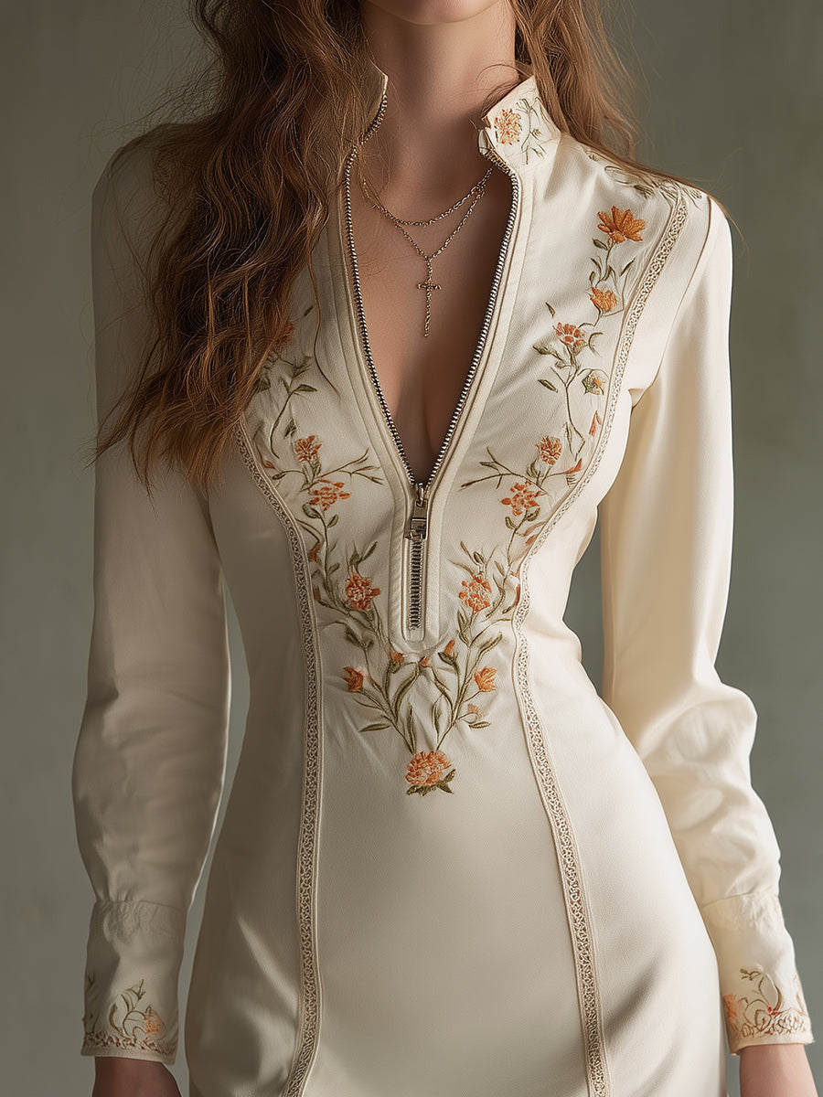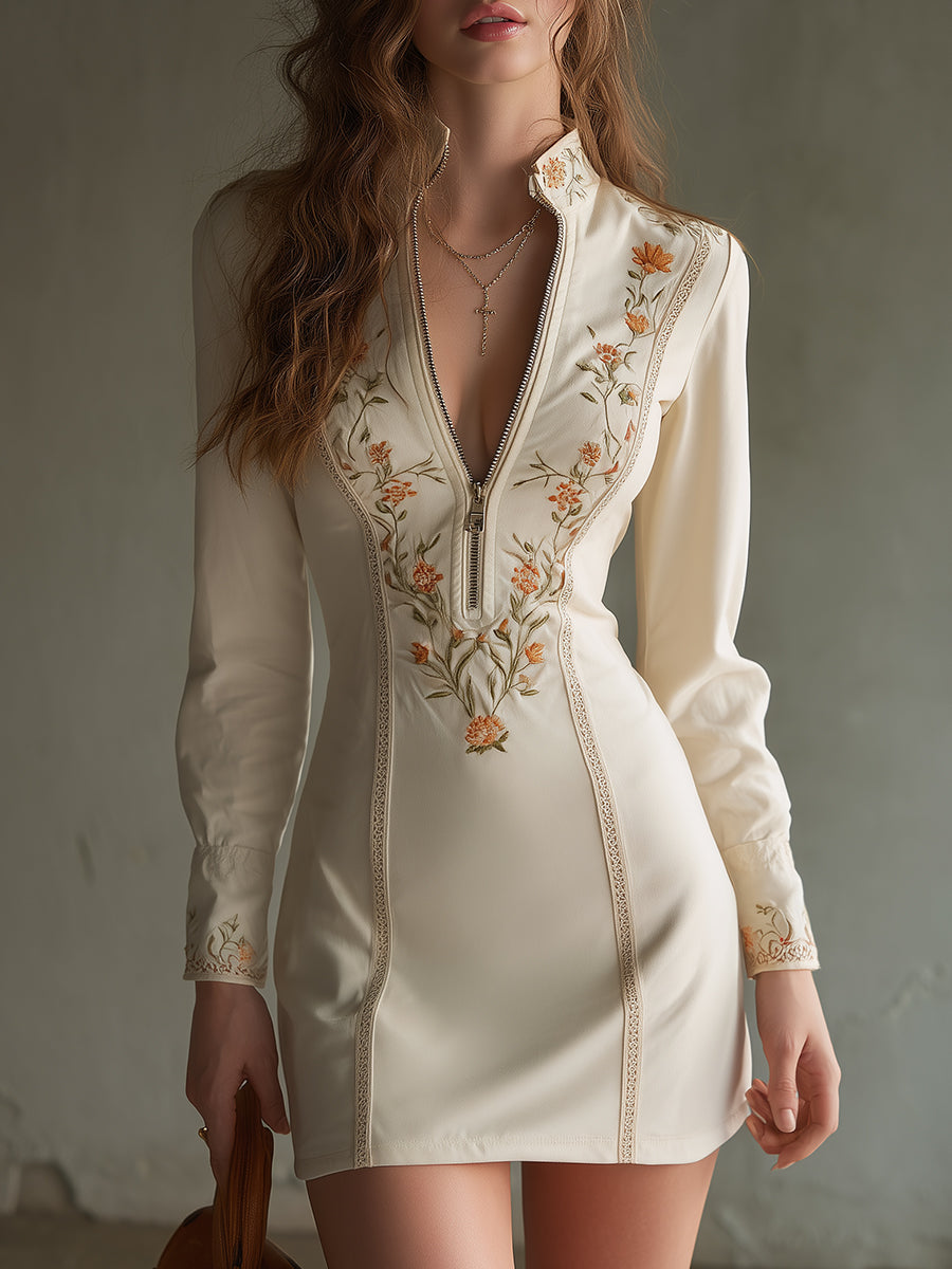Bohemian Embroidered Lace Front Zipper Slim Fit Mini Dress
