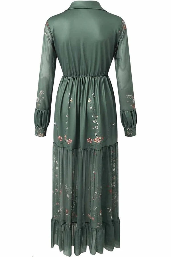 Bohemian Floral Print Lapel Long-sleeved Maxi Dress