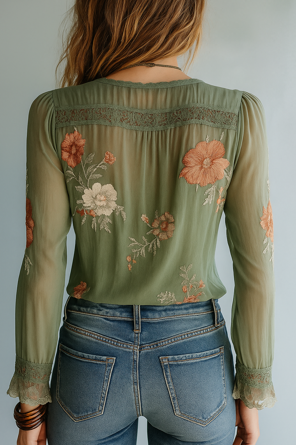 Add a touch of vintage charm to your wardrobe with this delicate sage green blouse. Featuring intricate lace details, sheer long sleeves, and vibrant floral pattern, this top effortlessly blends femininity with boho elegance. Perfectly paired with denim or skirts, it’s a versatile piece for both casual outings and special occasions.