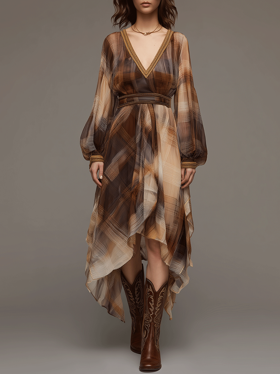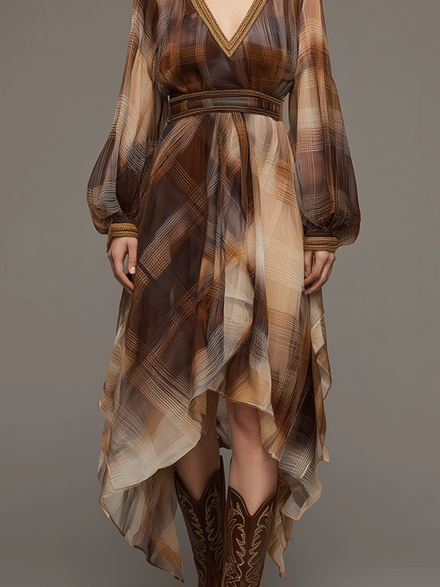 Step into the world of bohemian elegance with our exquisite Bohemian Gradient V-neck Lantern Sleeve Chiffon Asymmetric Midi Dress. Crafted to perfection, this dress embodies sophistication while offering a flowy and relaxed silhouette that echoes a sense of free-spirited style.