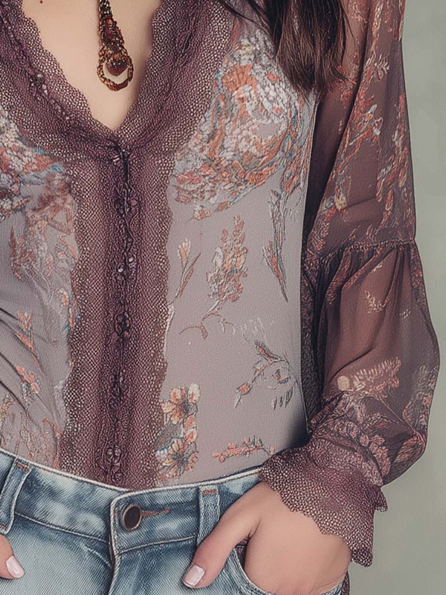 Bohemian Retro Lace Neck sheer Shirt