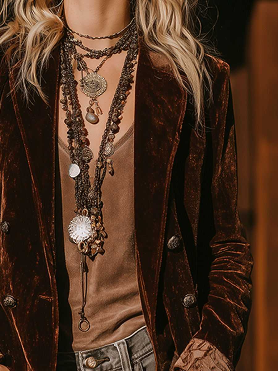 The Bohemian Velvet Double-Breasted Blazer is a luxurious piece that brings sophistication and elegance to any wardrobe. With its rich velvet fabric and bohemian flair, this blazer is designed to make a statement in both formal and casual settings.