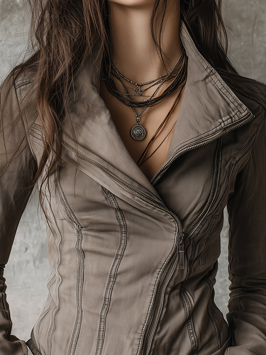Bohemian Washed Diagonal Placket Denim Jacket